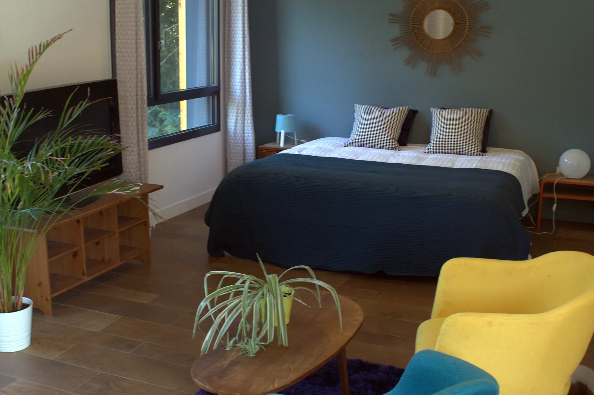 Plongez dans l’ambiance exotique de la chambre Gamboa, où un grand lit invite à la détente, un esprit jungle chic se mêle à des touches de bois clair, et la lumière douce filtre depuis la fenêtre sur la terrasse — un havre tropical à deux pas de Lyon. La chambre Gamboa dispose d’une salle de bain ouverte sur l’espace nuit, pour une atmosphère moderne et fluide.